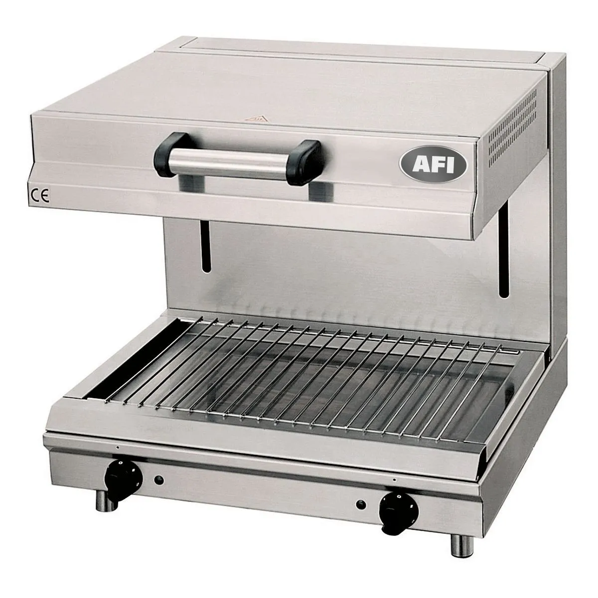 AFI Collin-Lucy salamandre. | Salamandre électrique de la marque AFI Collin Lucy, fabriqué en inox de haute qualité. Cet appareil prévu pour gratiner, griller, cuire et maintenir en température par chauffage électrique provenant de résistances blindées situées sur le plafond mobile. Plafond réglable en hauteur avec suspension extra souple et poignée isolante Deux zones de température séparées réglable par deux thermostats Grille support en acier inoxydable Bac amovible permettant un nettoyage rapide et efficace Puissance (kW) : 3,2Tension et voltage : 230 V MonoPoids (kg) : 52Largeur: 600 mmProfondeur: 580 mmHauteur: 580 mm.